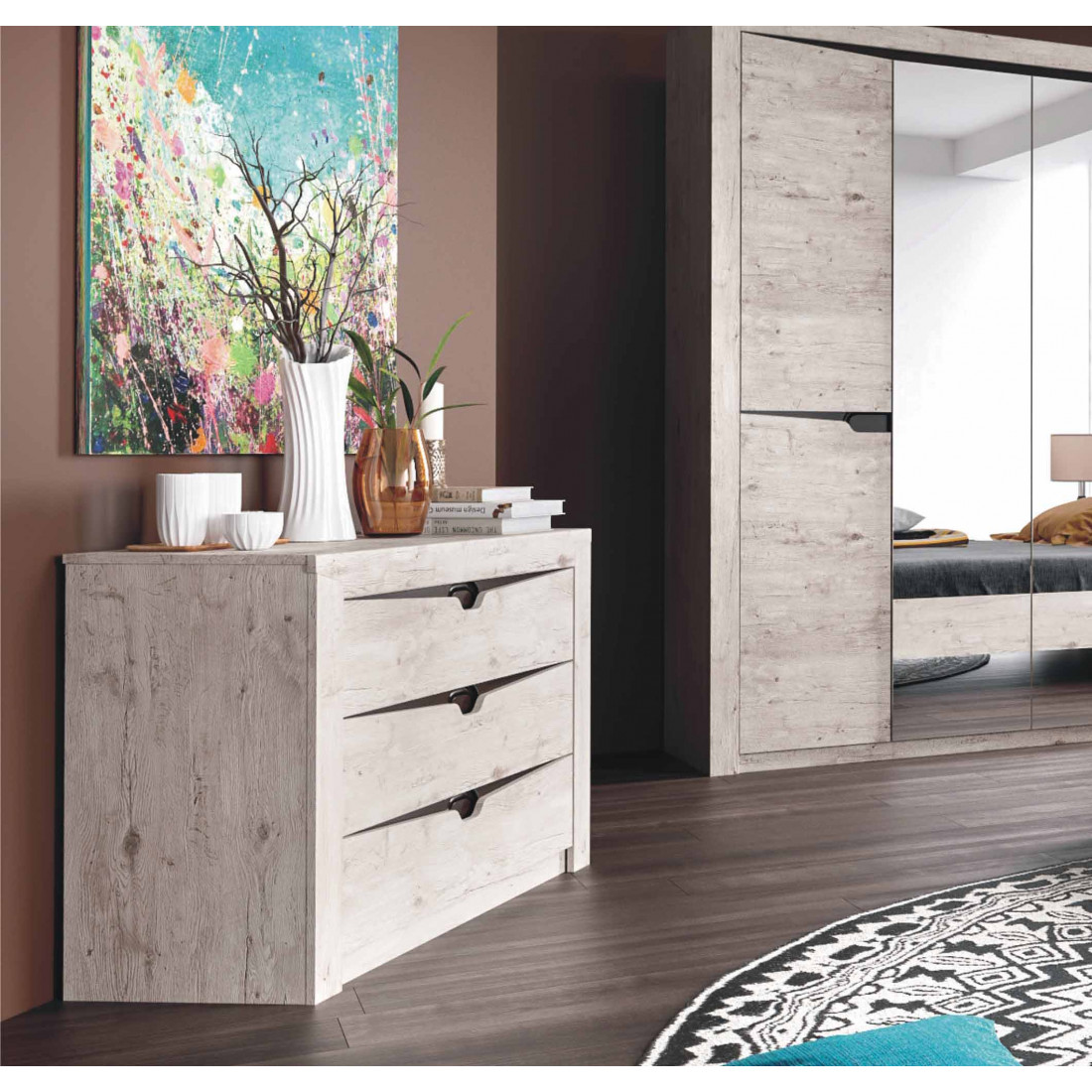 Спальный гарнитур Соренто композиция 2 порадует ценителей лаконичных форм своими простыми, современными линиями и приятной светлой деревянной текстурой. За спокойным фасадо скрывается много места для организованного хранения. Эргономичные фасады без ручек выдвижных ящиков и дверей шкафов подчеркивают современность мебели и ее минималистичную направленность.